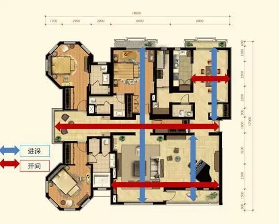 開間、進深:習(xí)慣上,我們把房間的主采光面稱為開間(面寬),與其垂直的稱為進深。也可根據(jù)房間門的朝向來確定開間和進深,房門進入的方向的距離為進深,左右兩邊距離為開間。
