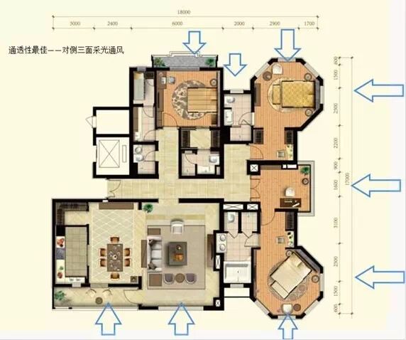 通透性主要是指戶型的通風(fēng)和采光性能。要保證戶型具有良好的通透性能,首先要求戶型要有良好的進深開間比,即戶型比較方正;其次戶型最好有兩面可以采光和通風(fēng),相對兩面采光通風(fēng)最佳(如南北、東西)。