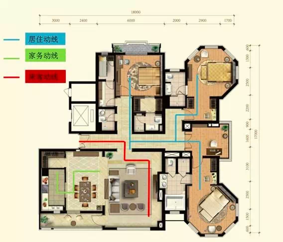 好的動線能夠提升戶型利用率,而差的動線會使大戶型變得“大而無當”,浪費空間。戶內(nèi)主要動線有三類,分別是居住動線、家務(wù)動線、來客動線。