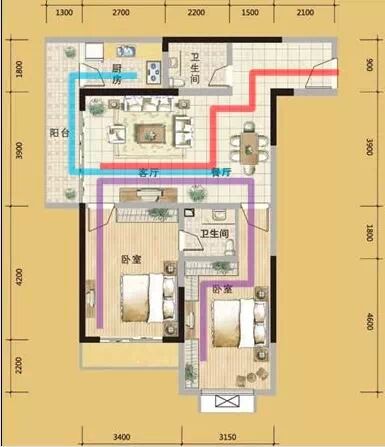 動線良好(從入戶門進客廳、臥室、廚房的三條條線不會交叉)范例如下:
